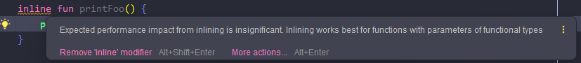 그래서 안드로이드 스튜디오에서 위 같은 경고를 표시해 준다. 왜 함수형 파라미터를 가지는 함수에서만 인라이닝이 성능 향상을 이끌어내는 걸까?
